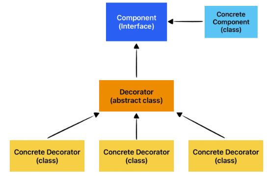- Decorator: Compoent 인터페이스를 구현하는 추상 클래스이다. 실제 기능을 수행하지 않고 기존 Component를 감싼다.